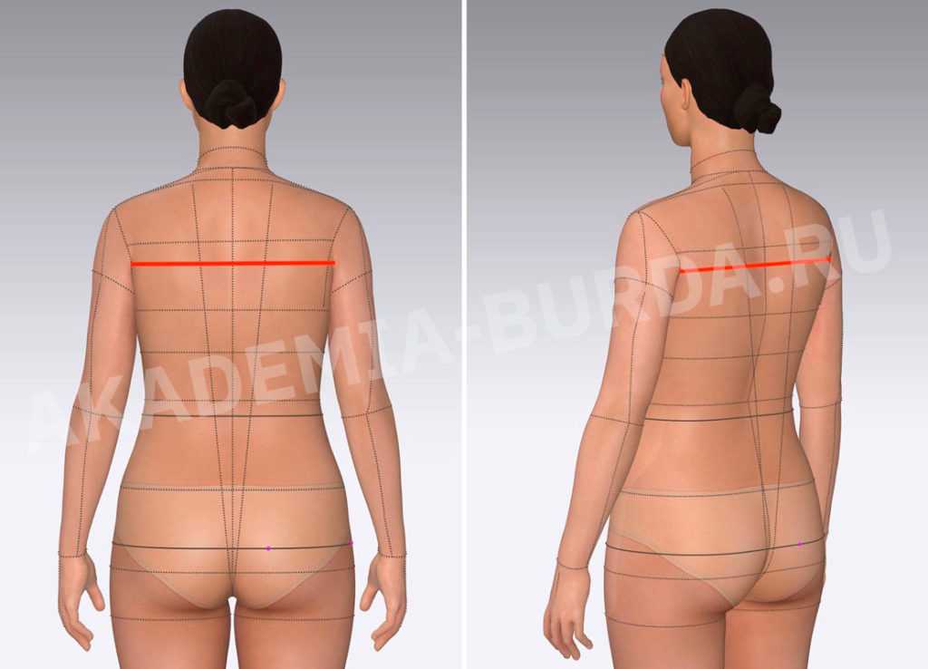 Длина талии спинки вторая – проходит от самой высокой точки предполагаемого плечевого шва у нижнего основания шеи до очертания талии сзади.