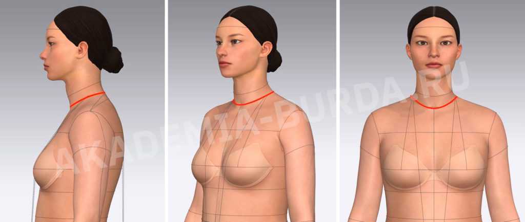 Обхват шеи – меряется внизу основания шеи, измерительная лента сходится в центре шеи со стороны лица. Не напрягайте шею, держите её в максимально естественном и комфортном положении, смотрите прямо.