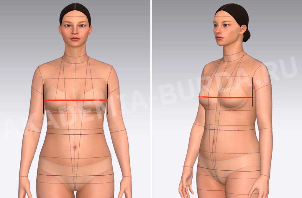Широта груди вторая – сантиметр проходит параллельно полу между лицевыми углами подмышек через наиболее выступающие точки груди.
