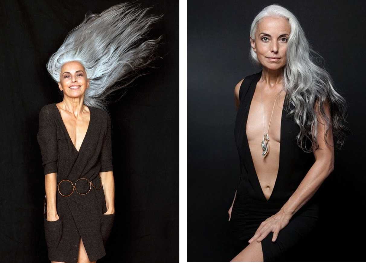 Она гордится своими роскошными седыми волосами и часто ухаживает за ними с помощью масок из рапсового масла. Все предложения вернуть ему прежний цвет отвергаются. Во-первых, серебряные волосы давно стали ее визитной карточкой, а во-вторых, будучи любительницей натуральных веществ, она отвергает краски с вредными химикатами. На фотографиях ее густые волосы выглядят блестящими в прямом и переносном смысле. И многие контракты были заключены благодаря необычному цвету элегантных локонов. Только серебро в ее волосах, кажется, выдает ее возраст, а ее потрясающе красивое тело остается неизменным.