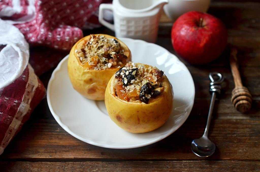 Для этого блюда нужно взять 1 зеленое яблоко, чернослив и курагу. Из фрукта нужно вытащить середину и наполнить сухофруктами. Выложить на тарелку и прикрыть фольгой. Запекать 7 минут в духовке.