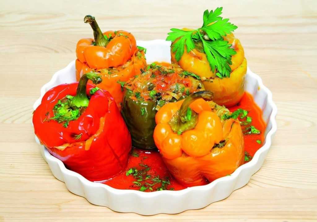 Чтобы сделать овощное блюдо, потребуется несколько перцев, лук, томаты, морковь, кабачки, чеснок. Все овощи, кроме перца, нужно измельчить и протушить 10 минут в сотейнике. Заполнить овощной массой очищенные перцы и проварить в мультиварке.