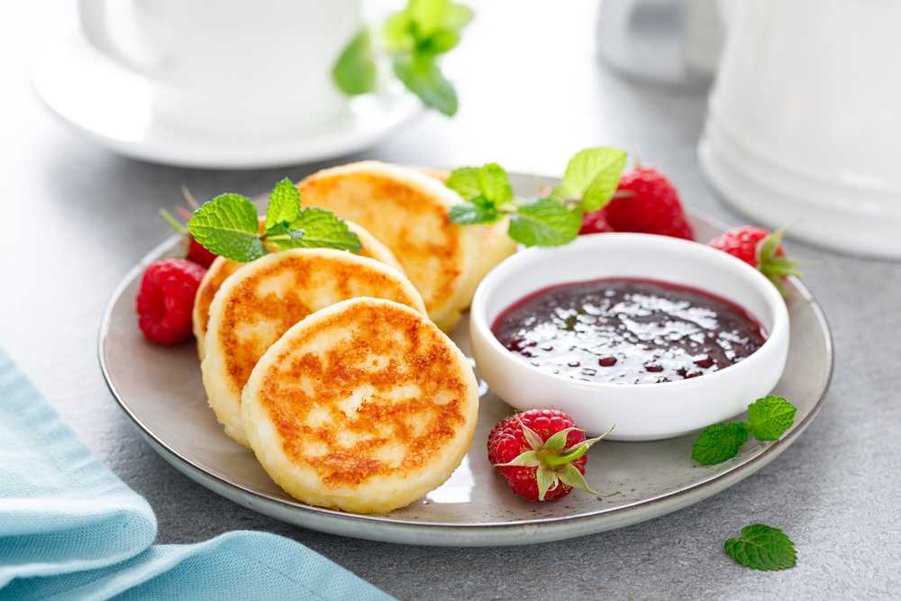 Завтрак: сырники со сметаной и свежими ягодами, некрепкий кофе с молоком.