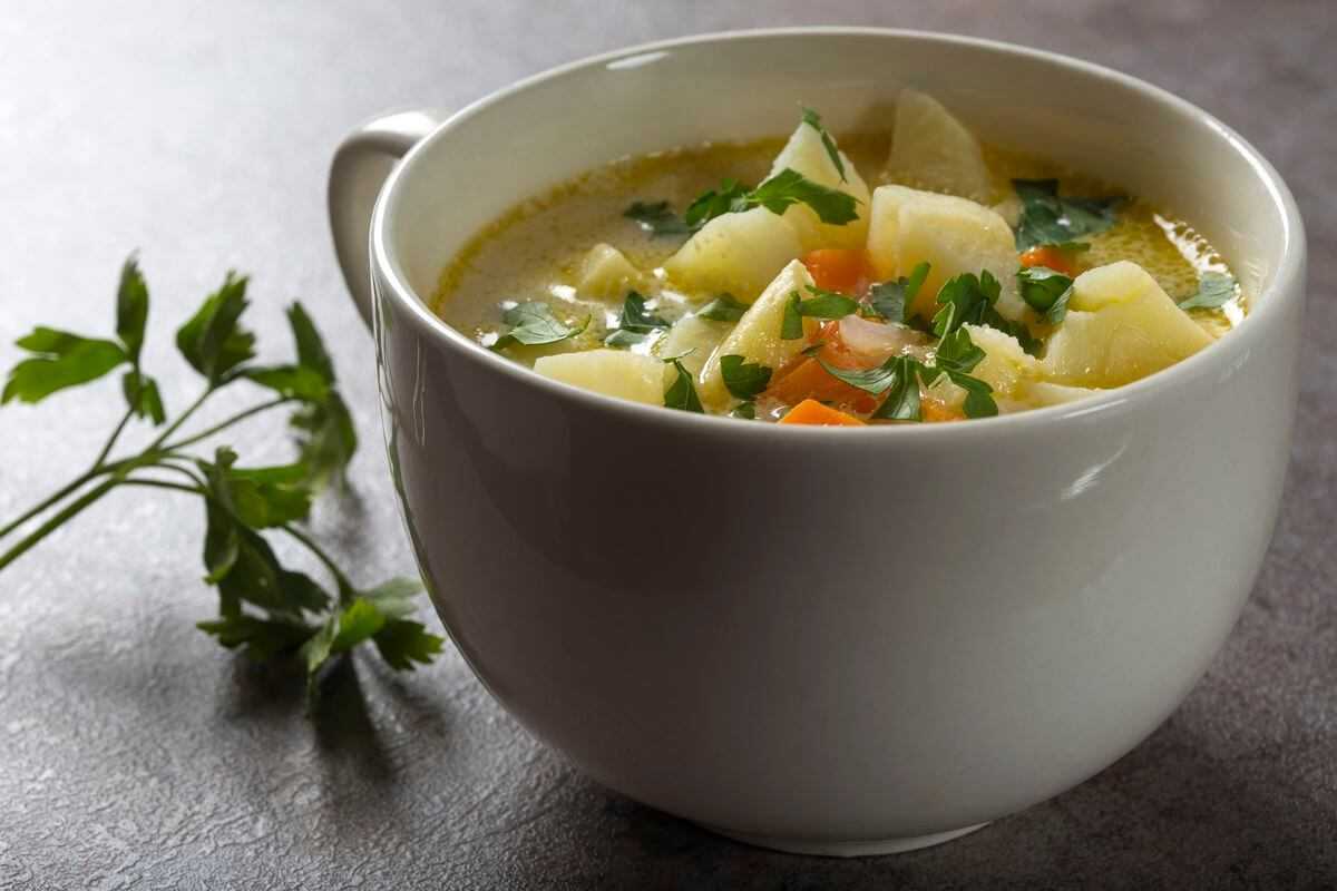 Луковицу, помидор и небольшую морковь пассеровать в растительном масле с пряностями. Овощи: по 300 г. картофеля, кабачков и капусты нарезать и залить холодной водой. Доведя до кипения, варить на медленном огне. За 10 минут до готовности добавить пассерованные лук и морковь, свежую рубленую зелень, посолить.
