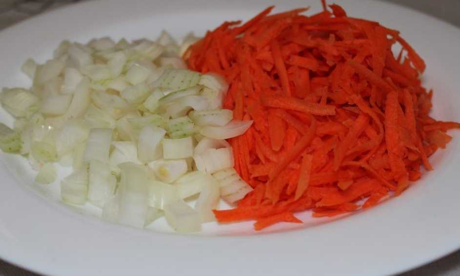На сковороде поджарьте лук и морковь. Кто-то пассерует овощи отдельно, но можно и сразу вместе всыпать морковь и лук. Обжаривайте до получения золотистого цвета