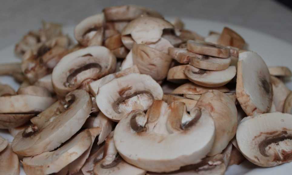 Шаг 4: Обжарка. Моем лук с морковью. Очищаем овощи и режем маленькими кусками. Морковку можно натереть на терке. Грибы режем тонкими пластинами.
