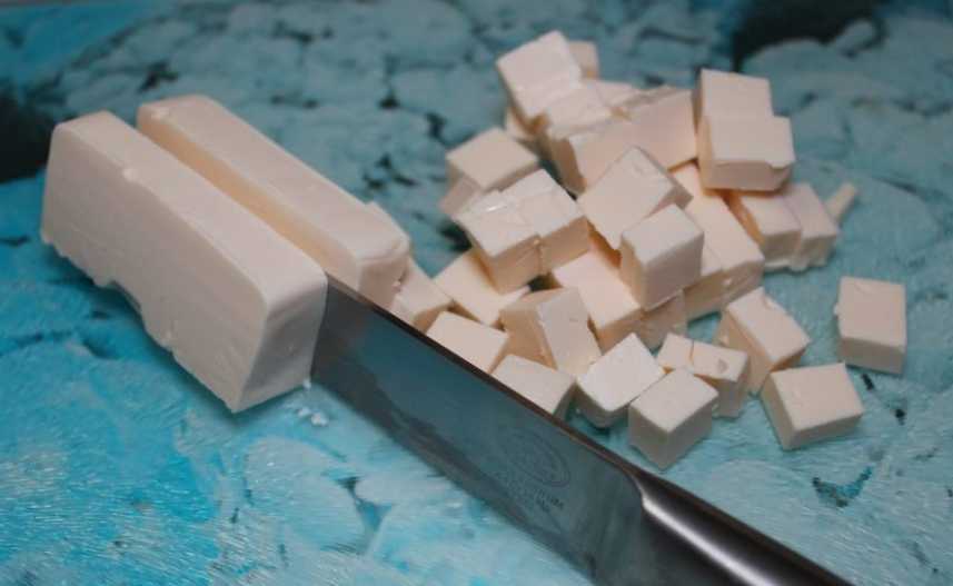 А теперь приступаем к сырку. Его нужно предварительно порезать на кубики