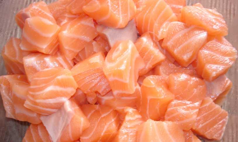 Нарезаю семгу на небольшие прямоугольники или кубики, приблизительно по 2 сантиметра.