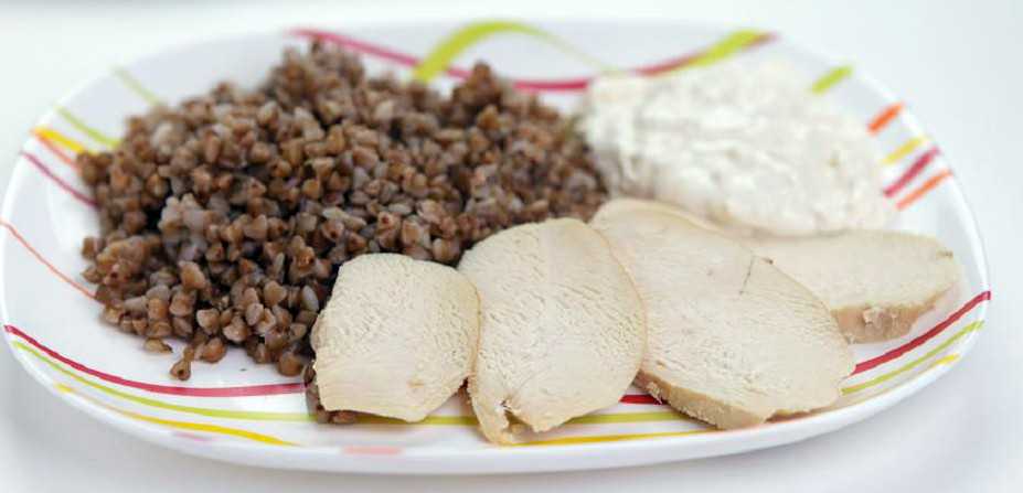 - обед: гречка с отварной куриной грудкой, чай,