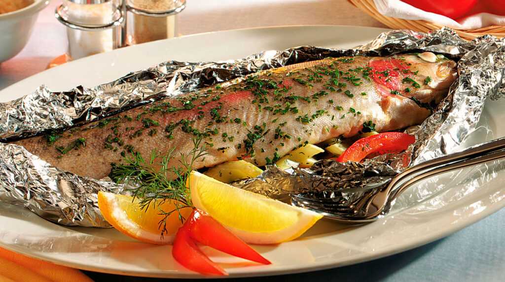Рассмотрим наиболее полезный вариант — рыбу в фольге с овощами: