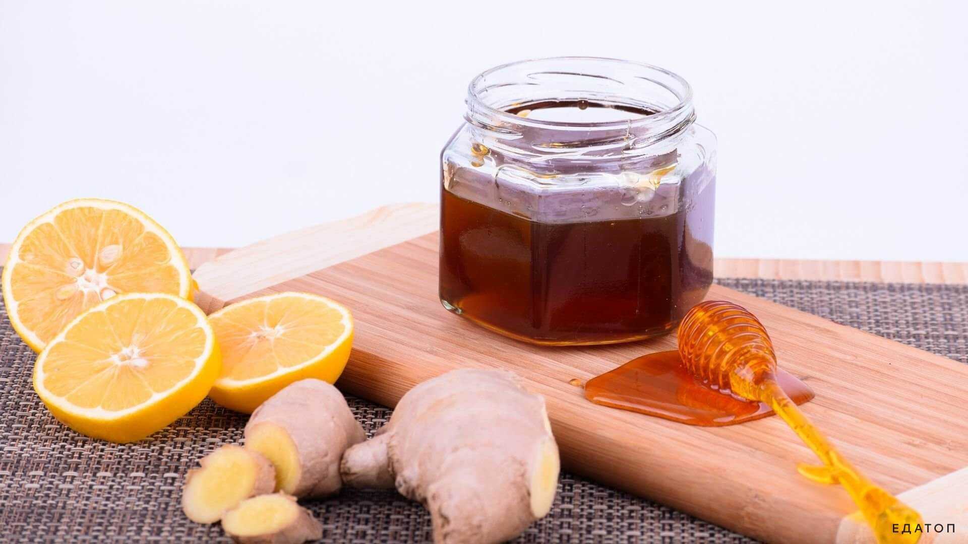 В 0,5 л кипятка добавьте пол ч. ложки измельченного имбиря. Когда вода станет теплой, размешайте в ней 1 ст. ложку пчелиного продукта и половинку тертого лимона. Укутав отвар, дайте ему настояться 30 минут.