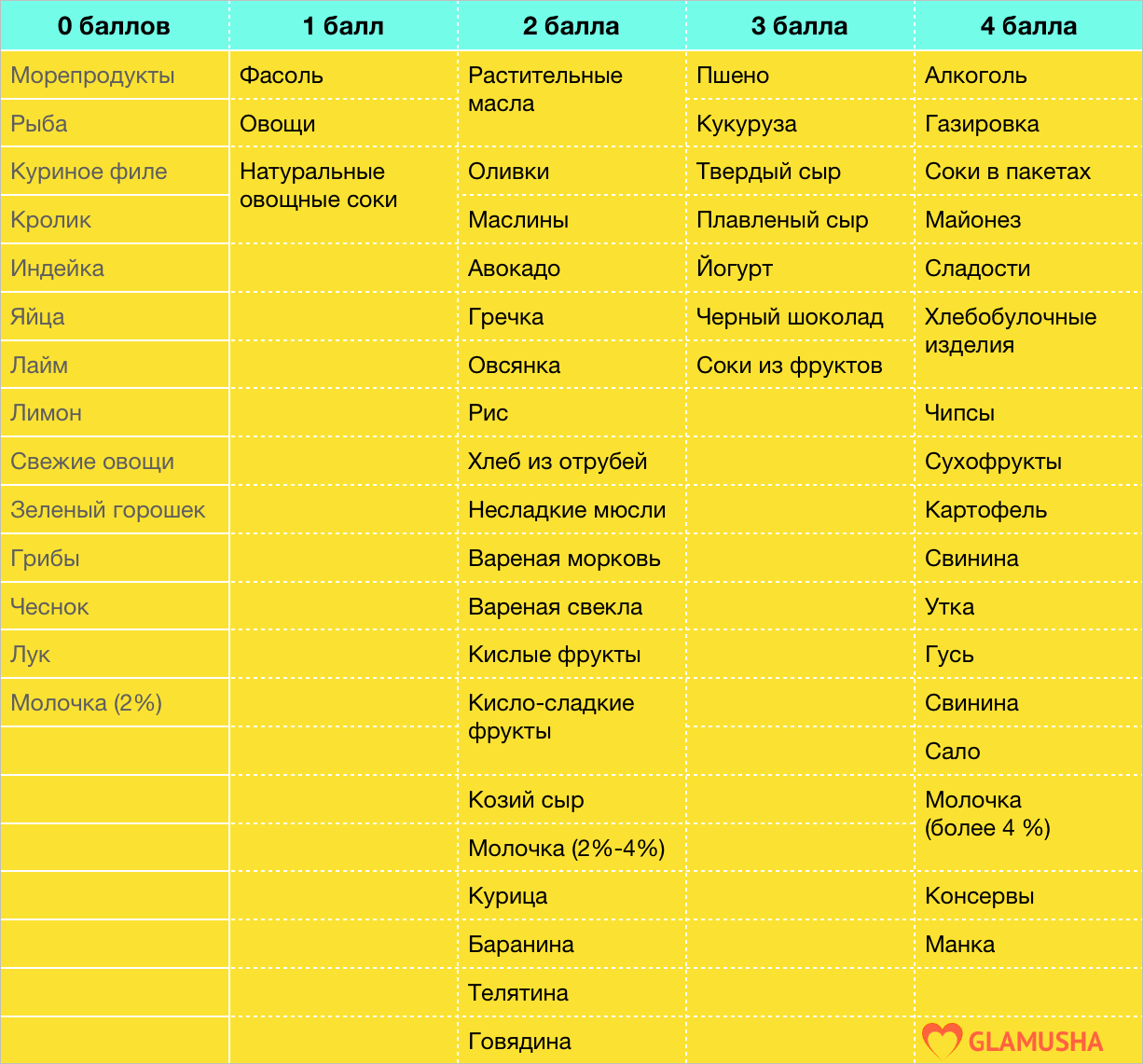 Система расчетов легкая: складывать баллы из таблицы продуктов. Человек сбалансировано питается любимыми и доступными продуктами в любое удобное время
