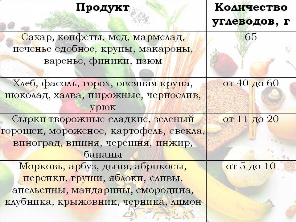 Основной акцент направлен на продукты, богатые белками и жирами. К примеру: мясные продукты, яйца, морепродукты и рыба, орехи, семечки, молочные продукты и цельное молоко. Для поддержания гормона инсулина в норме, достаточно употреблять до 1 г углеводов на каждый кг веса тела в сутки. Полезные микроэлементы можно получить из зерновых культур, риса, кукурузы, картофеля, овсянки, гороха. Расчет ежедневного потребления калорий позволит составить идеальный набор углеводов, белков и жиров. Предлагаем вам наглядный пример простых и сложных углеводов.