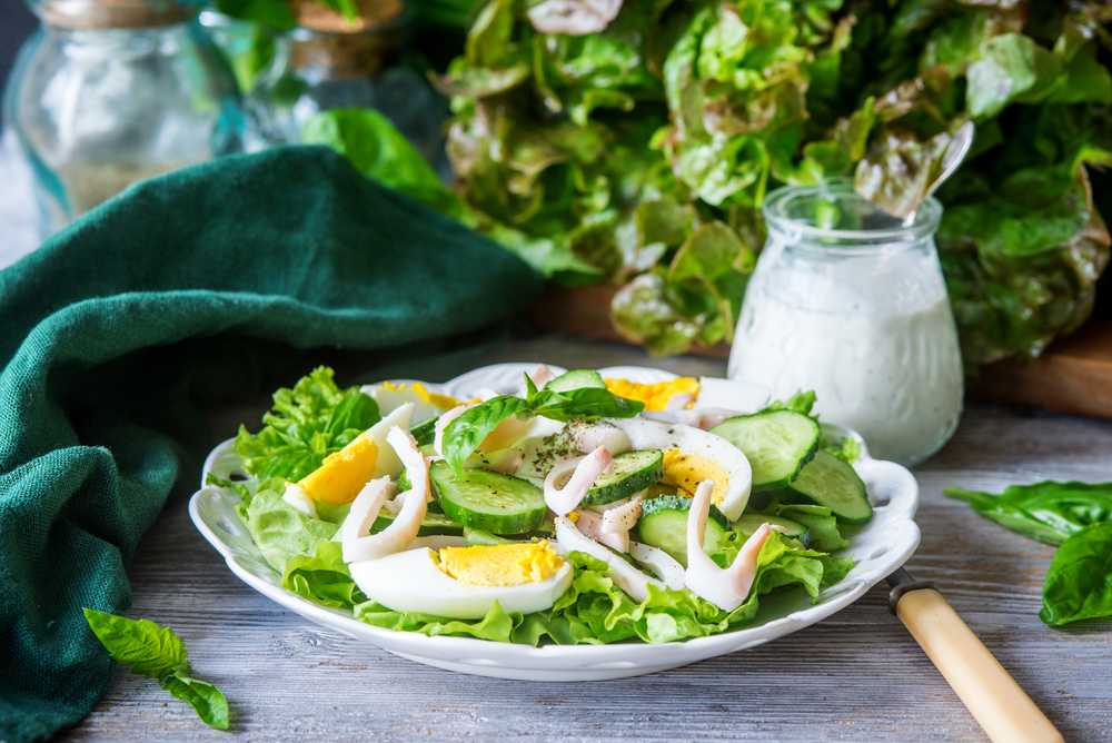Ужин: салат из 300 г некрахмалистых овощей; вареное яйцо и стакан нежирного молока или кефира.