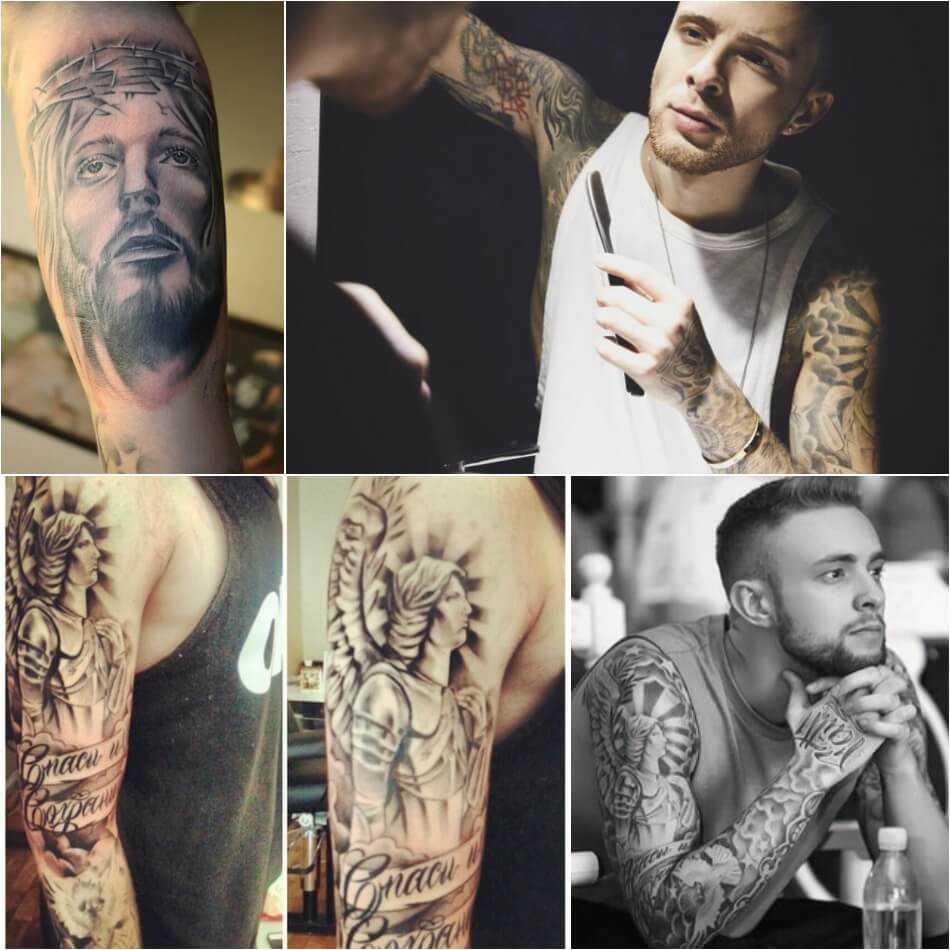 Затем общую композицию рукава дополнил портрет Иисуса Христа в терновом венке, изображение ангела, свеча (символ молитвы, обращения к богу), голубя (символ святого духа) и надпись «спаси и сохрани». Значение тату говорит само за себя, артист посвящает их вере в бога, которая дает ему сил и вдохновения.