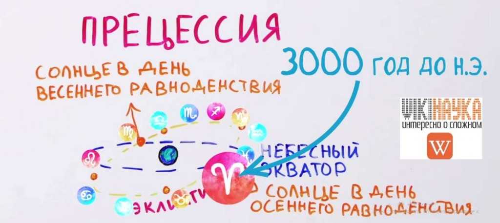 В 3000 году до н. э. это был Овен. Но из-за гравитационного взаимодействия планет ось вращения нашей планеты описывает конус, а равноденствие ежегодно наступает раньше на 20 минут.