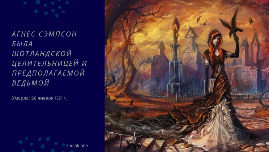 Ваша ведьма — Агнес Сампсон. Она была шотландской целительницей, которую обвиняли в колдовстве во время великой охоты на ведьм.