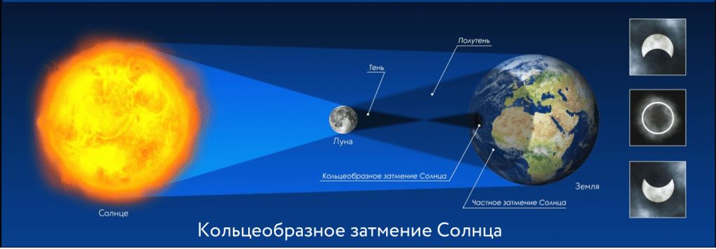 Кольцевое солнечное затмение происходит, когда Луна покрывает центр Солнца, оставляя видимыми его внешние края, в результате чего образуется «огненное кольцо» вокруг тени Луны. Так происходит, когда затмение складывается вблизи лунного узла, при этом Луна находится в апогее (самой дальней точке от Земли), поэтому внешний край Солнца остается видимым как кольцо солнечного света.