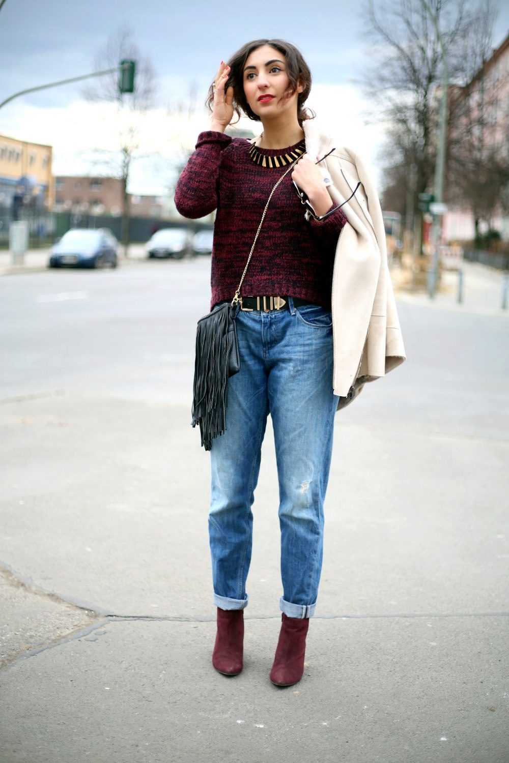 - С вишневой обувью сочетаются водолазки в пастельной гамме, джинсы со рваными коленями, рубашки поверх футболки. Тут можно использовать ботинки без каблука. Они могут быть украшены вставками из лакированной кожи или замши.
