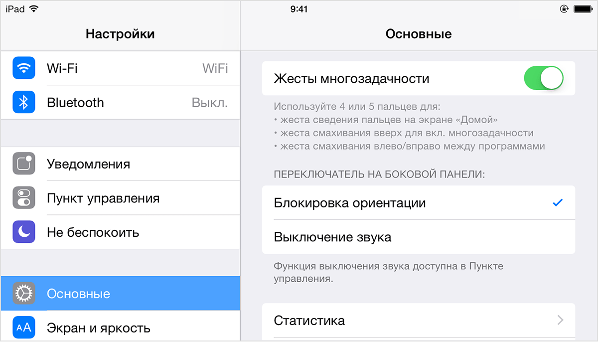 В iPad блокировка данной поворотной функции отличается от описанного порядка включения в смартфонах. Чтобы включить автоповорот дисплея в iPad, достаточно зайти в меню «Настройки», перейти в раздел «Основные» и в подразделе «Переключатель на боковой панели» активировать опцию «Блокировка ориентации». В отличие от iPhone в планшетном устройстве можно в горизонтальном положении открывать приложения и социальные сети.