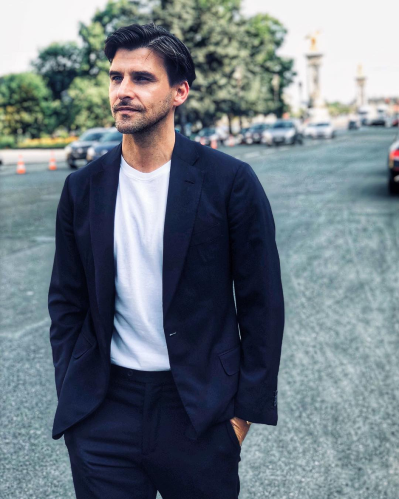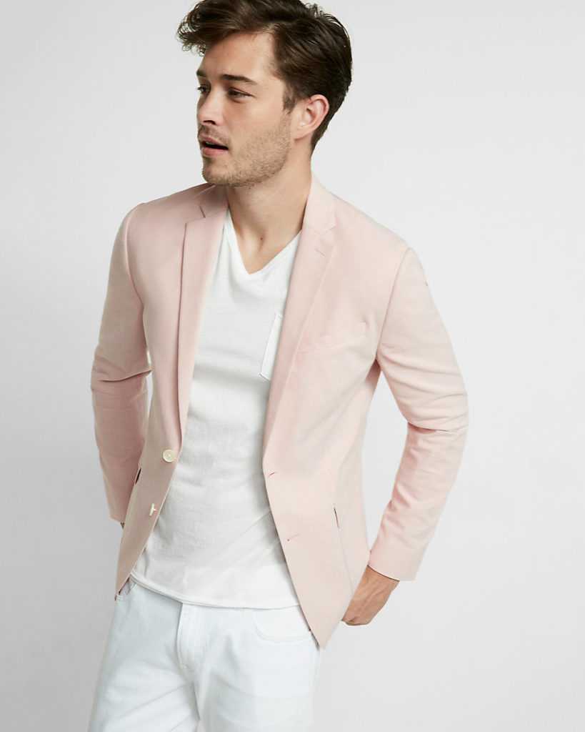 Повседневный мужской жакет или блейзер выглядит с футболкой лучше, чем широкий пиджак с объемными плечами.