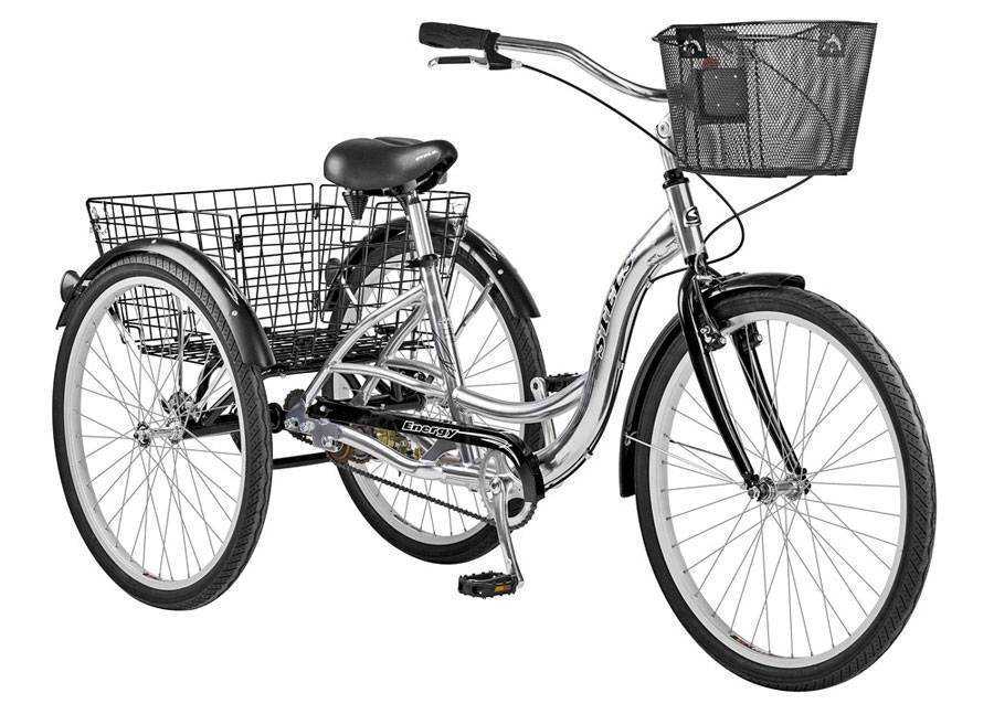 Трехколесный дорожник – грузовой вариант, с удлиненной рамой. Половину велосипеда занимает багажник высокой вместимости и передняя корзина.