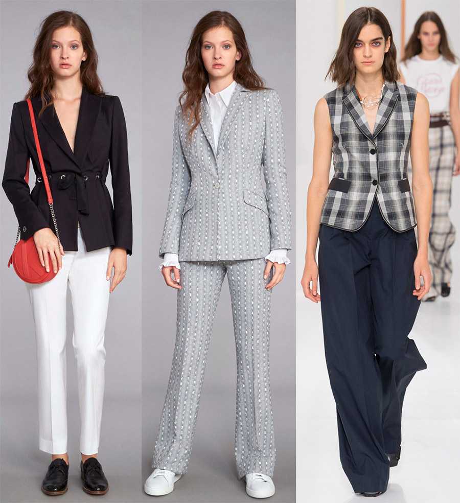 Брючные костюмы представлены не только классическими комплектами, но и моделями с интересными и необычными акцентами, свободными формами верха или низа. Позволяют формировать как строгие, так и романтические, вечерние образы. Наряды свободного кроя помогают создавать роскошный повседневный образ. Зауженные брюки подчеркивают красоту фигуры их обладательницы.