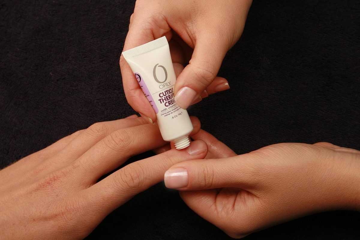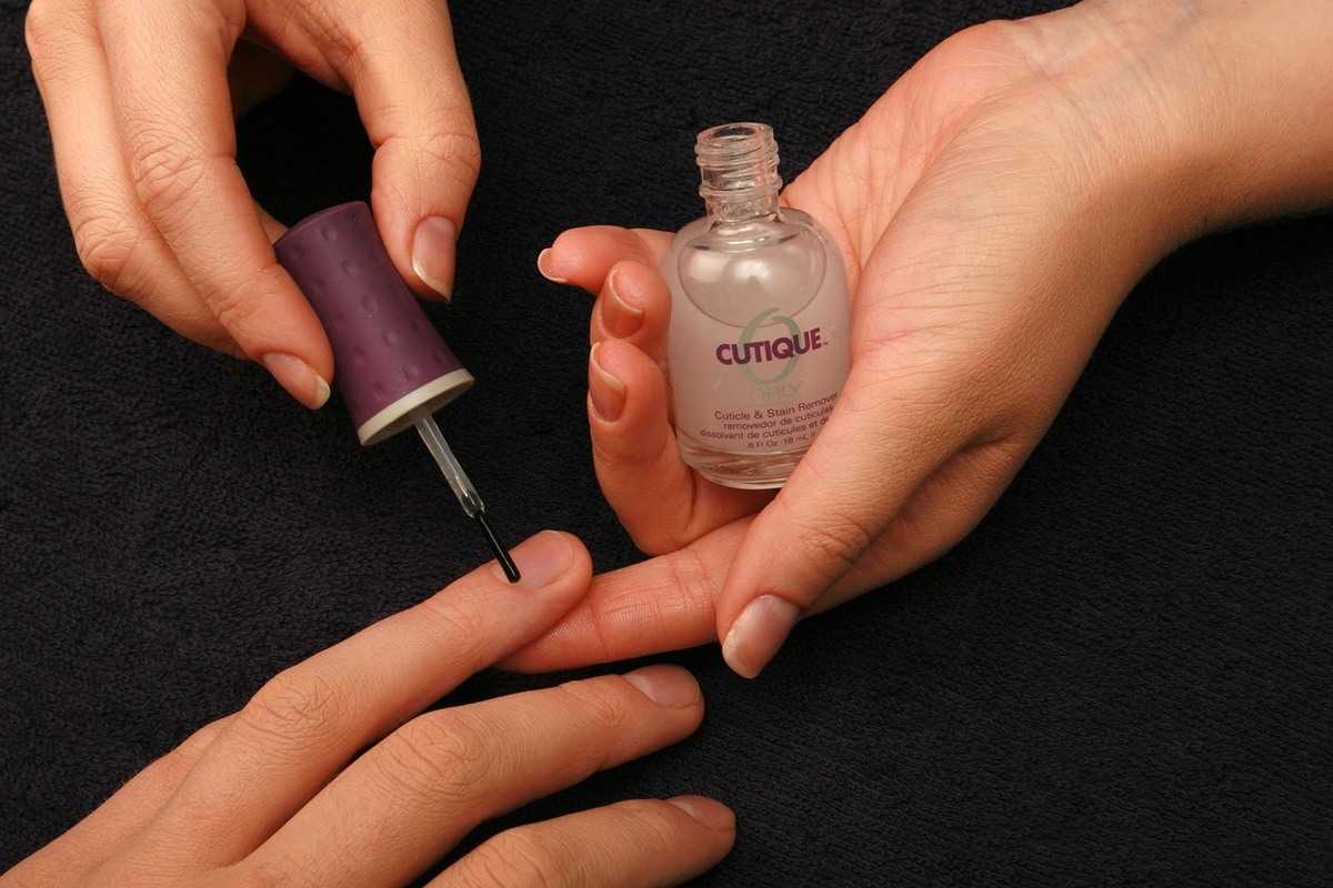 Размягчить кутикулу можно и при помощи специальных косметических средств — в их основу входят кислоты, разъедающие огрубелую кожу. После того, как руки подержали в воде или применили средство, кутикула и огрубелая кожа удаляются ножничками или апельсиновой палочкой.