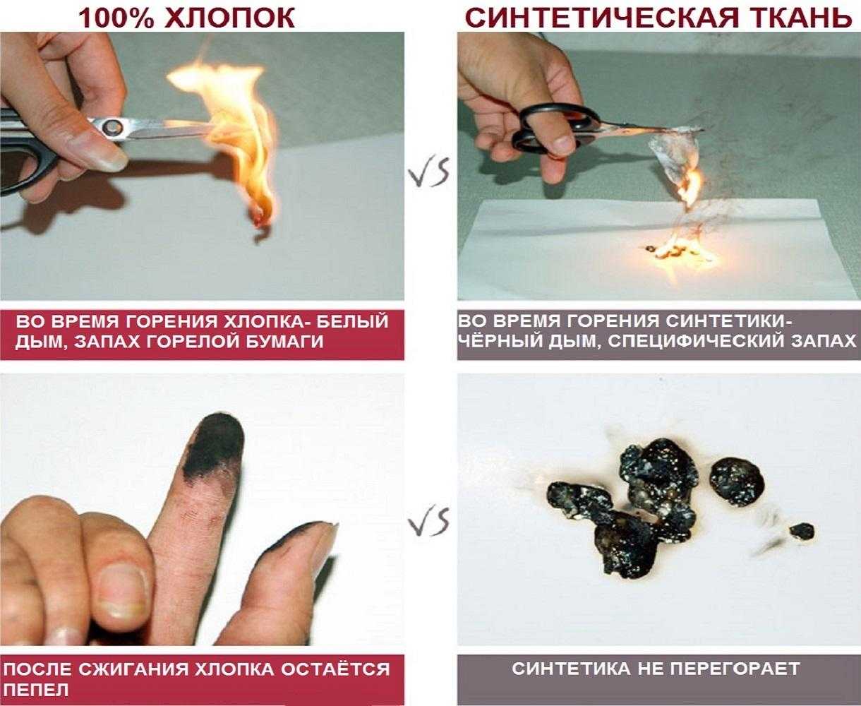 Синтетика плохо проводит тепло, поэтому если подержать ткань в руке, она будет оставаться прохладной. При горении она плавится, распространяя кислый запах.
